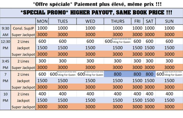 2) Tous les jeudis à 19h, 2 lignes à 600, samedis à 12h30, 2 lignes à 400 et dimanches à 12h30, 2 lignes à 600. (Offre spéciale week-end : vendredi et samedi à 19h, 2 lignes à 600).