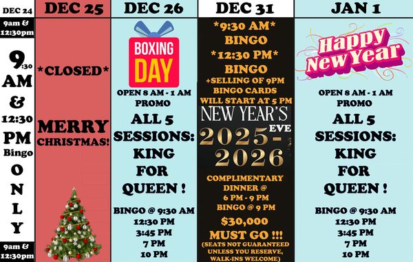 1. Dec 31st, we are cancelling our 3:45 pm and 10 pm sessions; instead, we will host a NYE Complimentary Dinner, conduct a 9pm Special Bingo, and say Hello to 2026 with Live Entertainment, a Special Countdown and Balloon Drop.